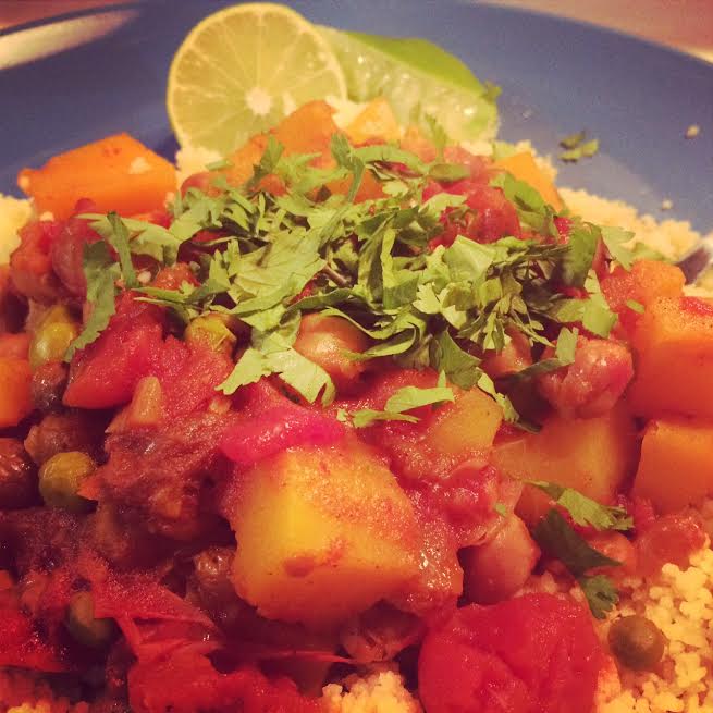 - Heat a large skillet over medium-high heat. Add remaining 1 tablespoon oil; swirl to coat. Add squash and sauté 5 minutes. Add squash to slow cooker/pot. Cover and cook on HIGH 1 hour, or low-medium heat. Stir in peas. Sprinkle with cilantro. Serve over couscous with lime wedges!