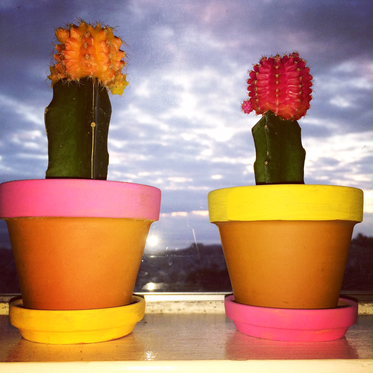 So this is nothing special really…just thought I’d post this cute idea (I think!) for some terracotta pots. I bought these cacti from CVS for about $.40 (they were 90% off for some reason) and we all know I can’t resist a $.40 plant. Anyway, I mixed and matched the color scheme to get the plant matching pink and yellow look.